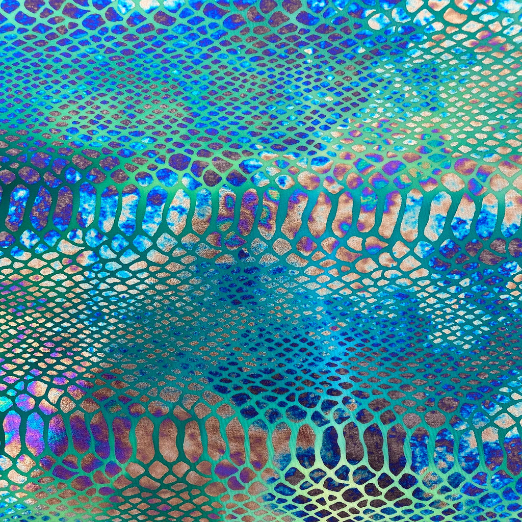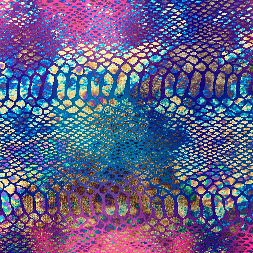Transform your creations with our stunning Holographic Tie Dye Taipan Snake Skin Nylon Spandex Fabric, a versatile choice for any fashion enthusiast. This eye-catching fabric features a unique tie-dye pattern infused with a holographic snakeskin print, making it perfect for those looking to make a bold statement. Please note that the image may vary due to monitor settings.