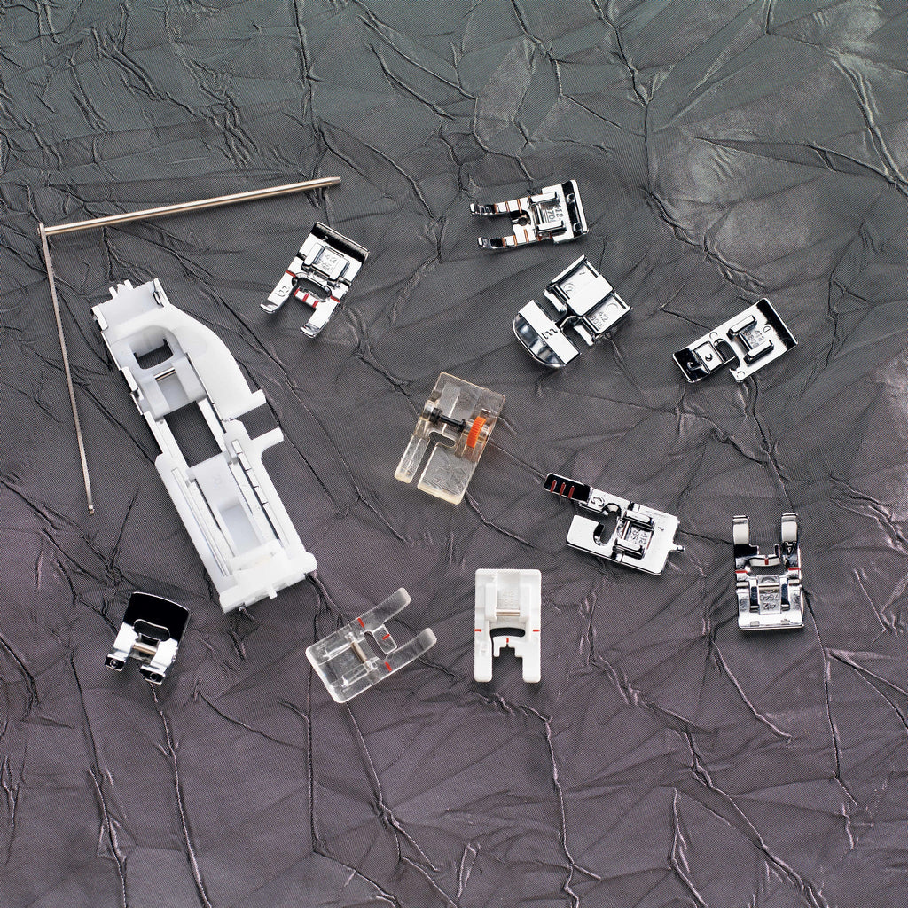 Features a useful Sewing Guide Reference Chart. The chart recommends the right presser foot, stitch length and width, thread tension and presser foot pressure for different fabrics and techniques.