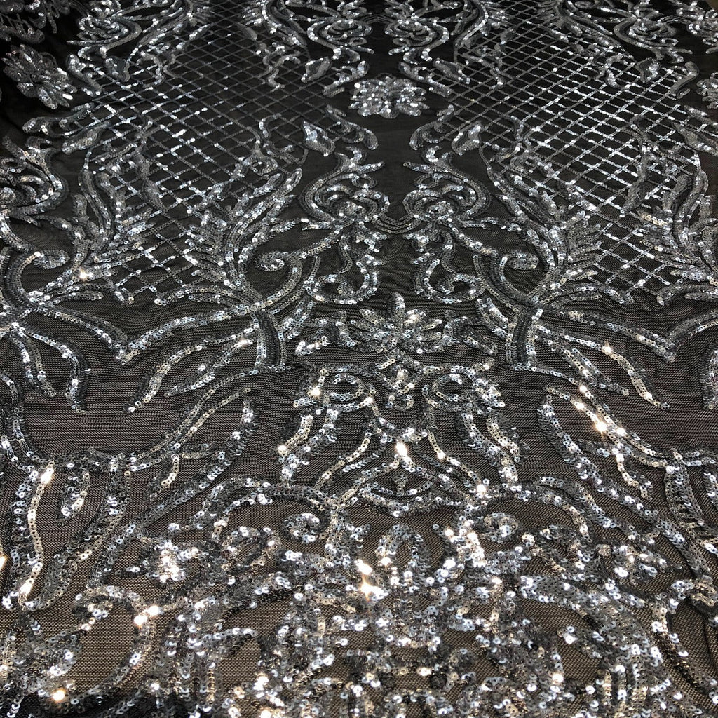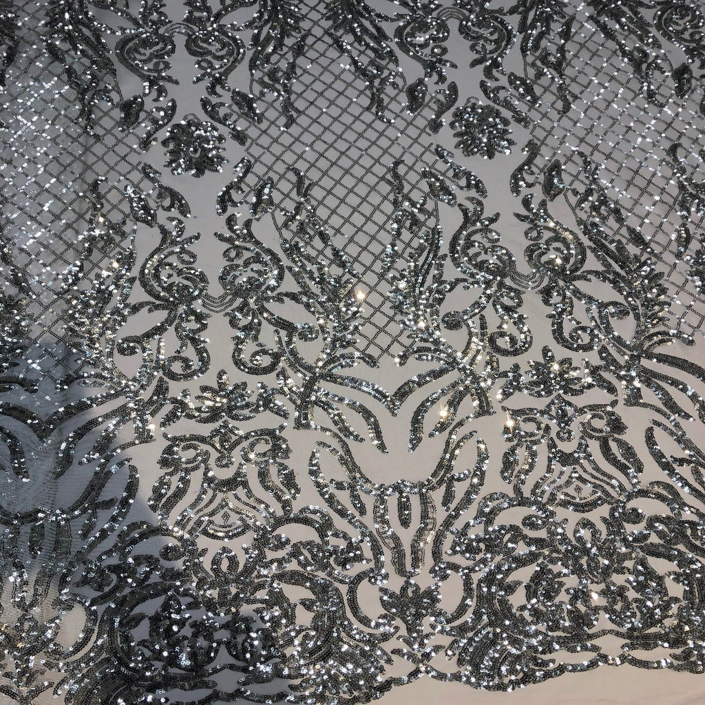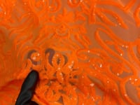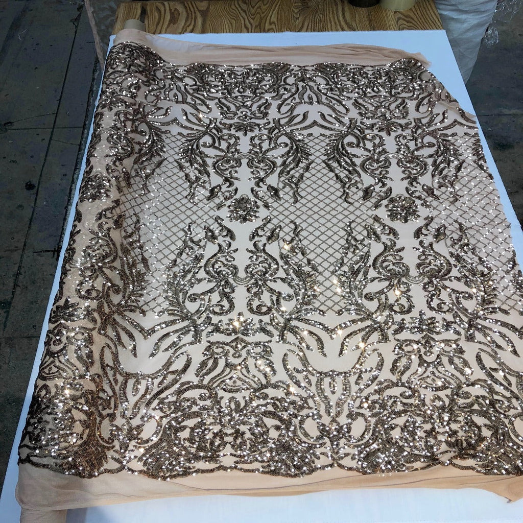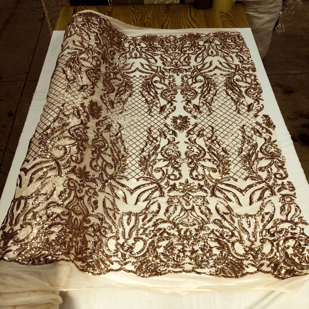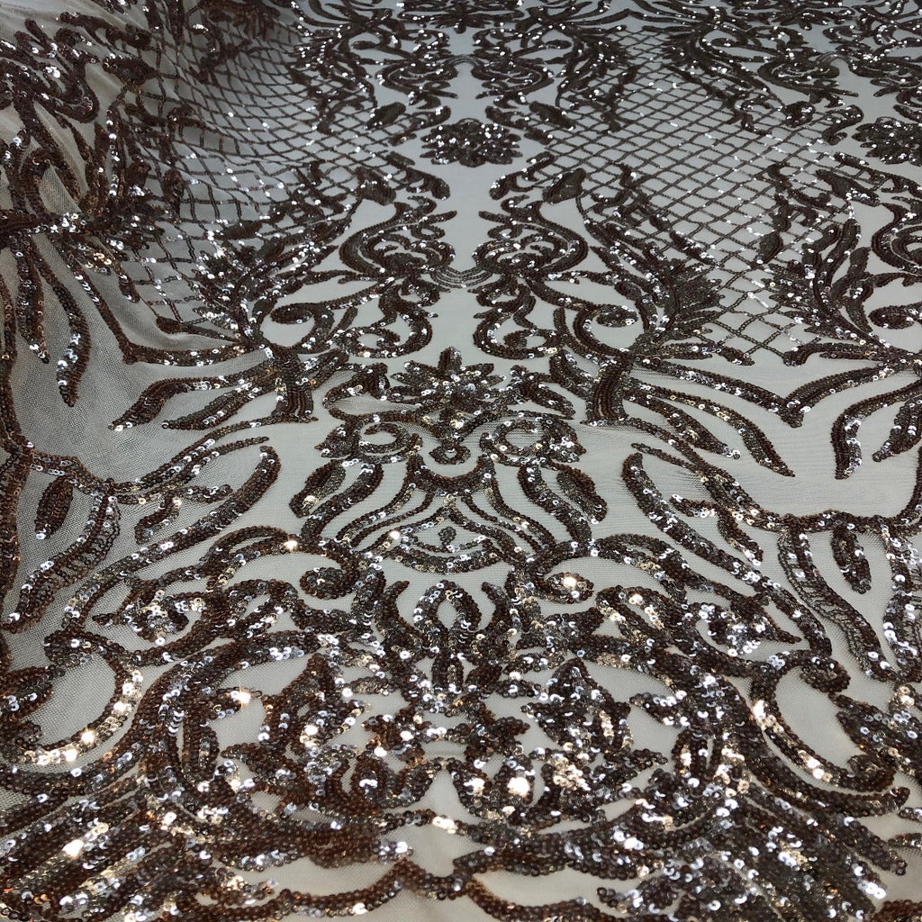 This beautiful and elegant Luna Sequins Lace Fabric is truly one of a kind. Crafted with a luxurious four-way stretch nylon mesh backing, this fabric features a stunning sequin design that captivates and dazzles. Sold by the yard, you can create custom lengths to suit your needs; if more than one yard is purchased, it will arrive as a continuous piece (for example, two yards will be delivered as a 60" x 72" piece).